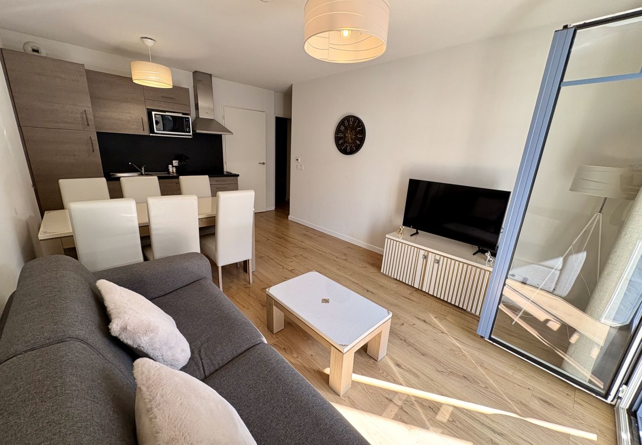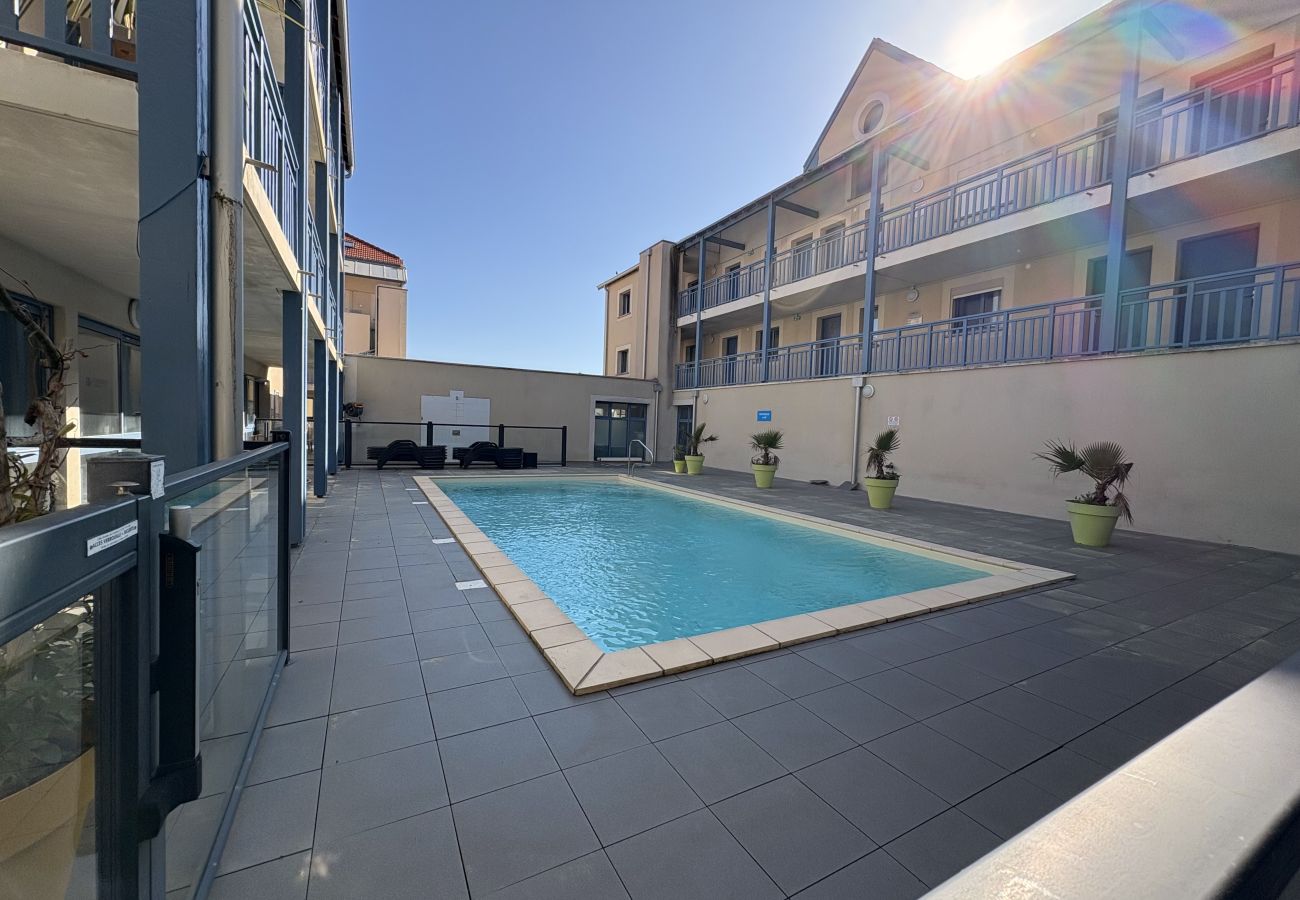 Le tout donnant sur un balcon exposé Ouest donnant sur la piscine de la résidence, aménagé avec salon de jardin, et plantes.