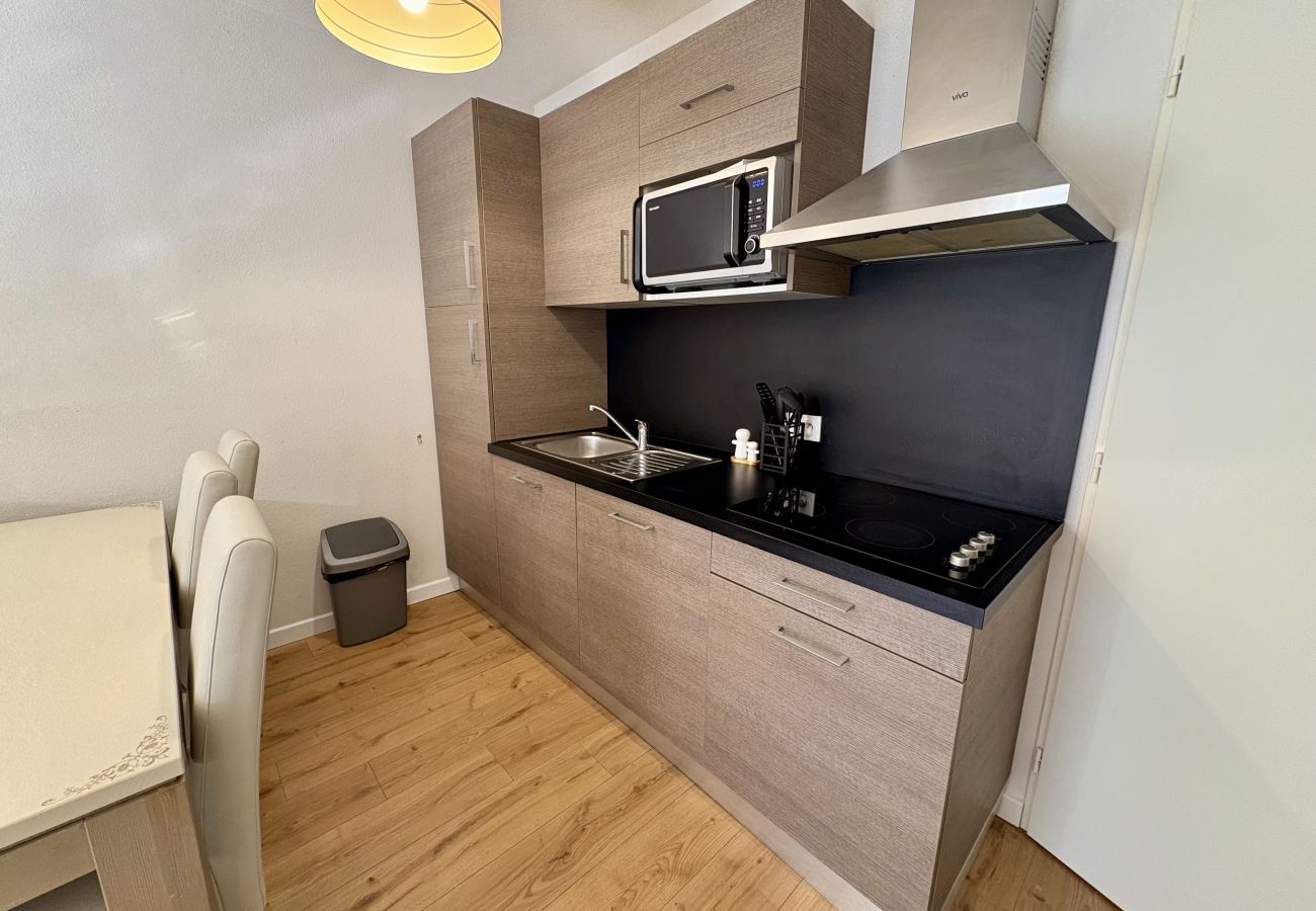 Agréable Appartement de type T2 Cabine de 42m² avec balcon et parking, situé au 1er étage d'une résidence sécurisée avec piscine et ascenseur, en front de mer de Biscarrosse Plage. Ce logement vous offre : Une Entrée avec parquet et placard (table et fer à repasser, aspirateur, serpillière,…), Une Cabine avec lit superposés 90cm x 2 avec fenêtre et rideau occultant côté coursive.