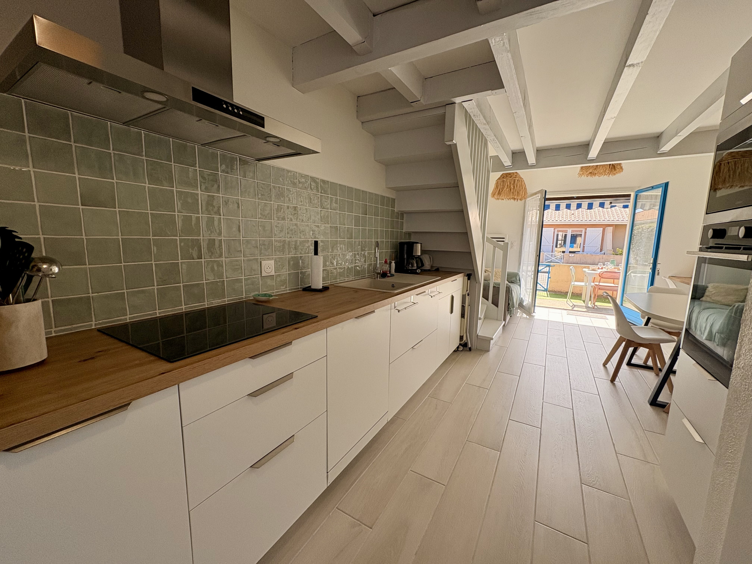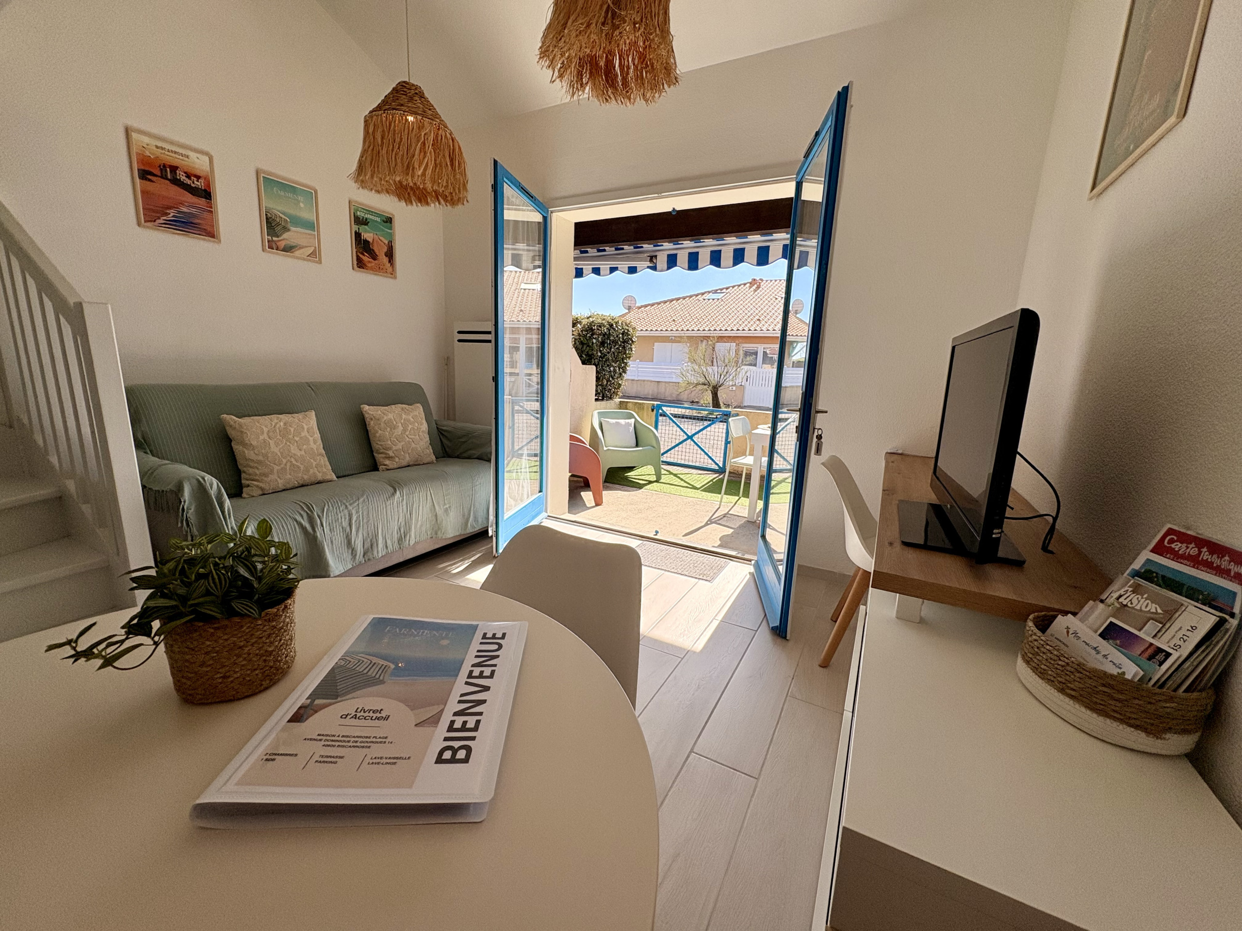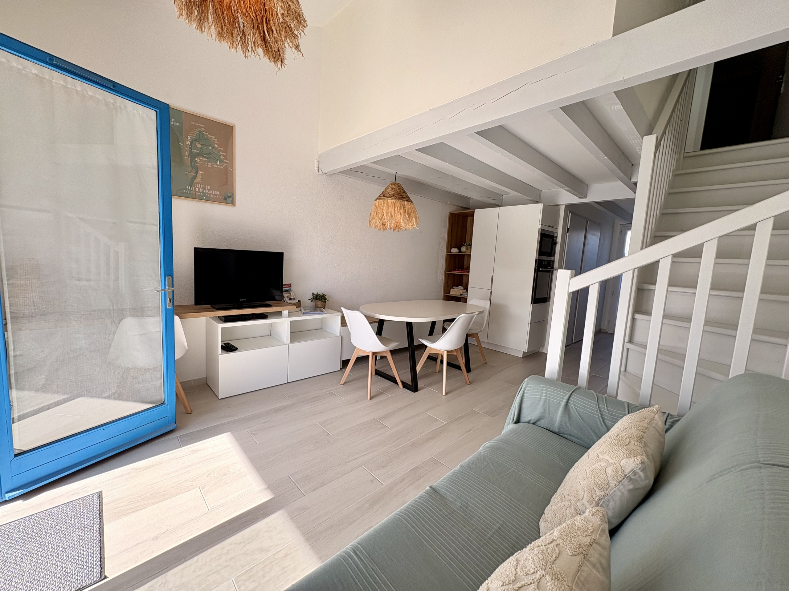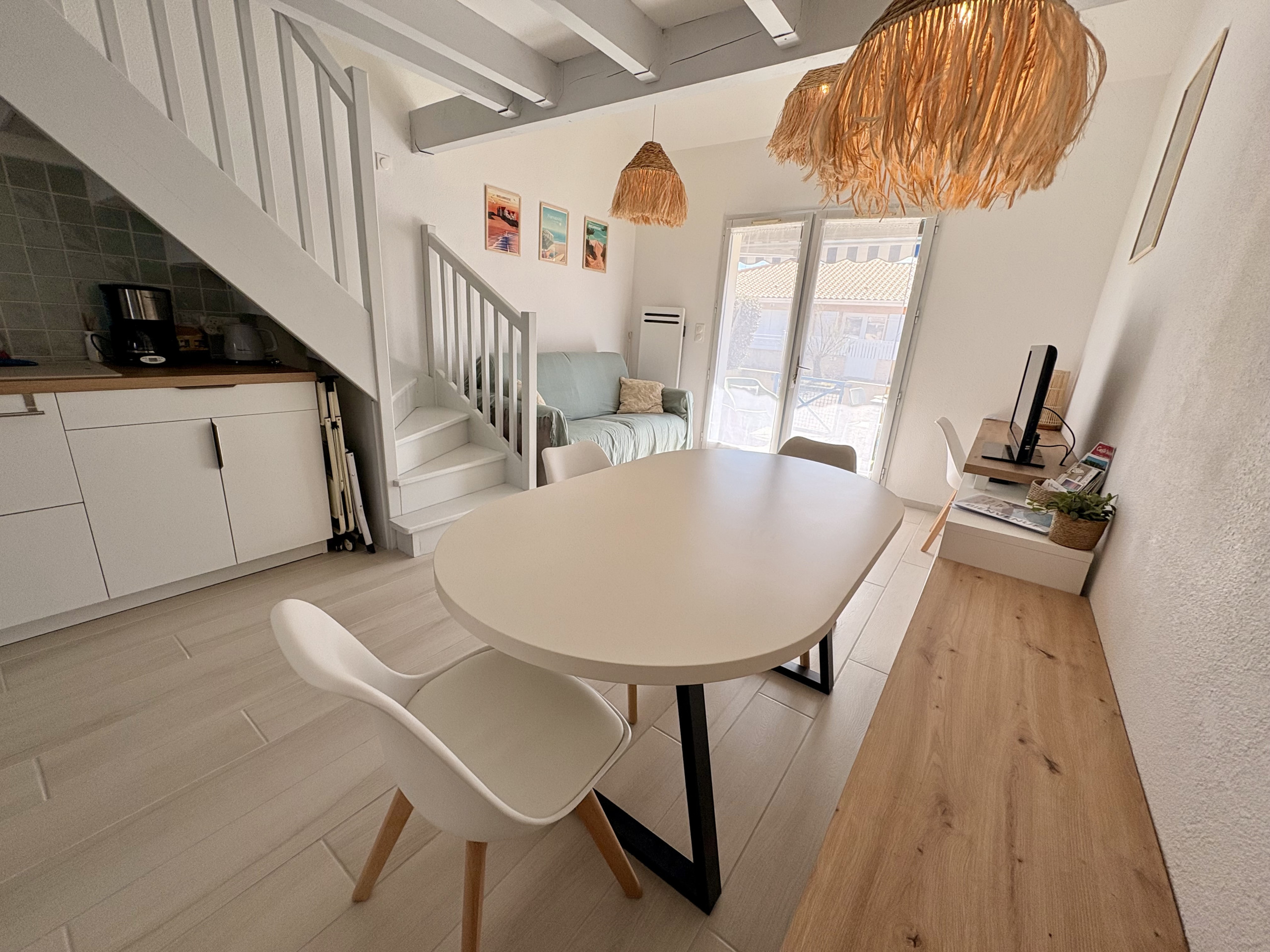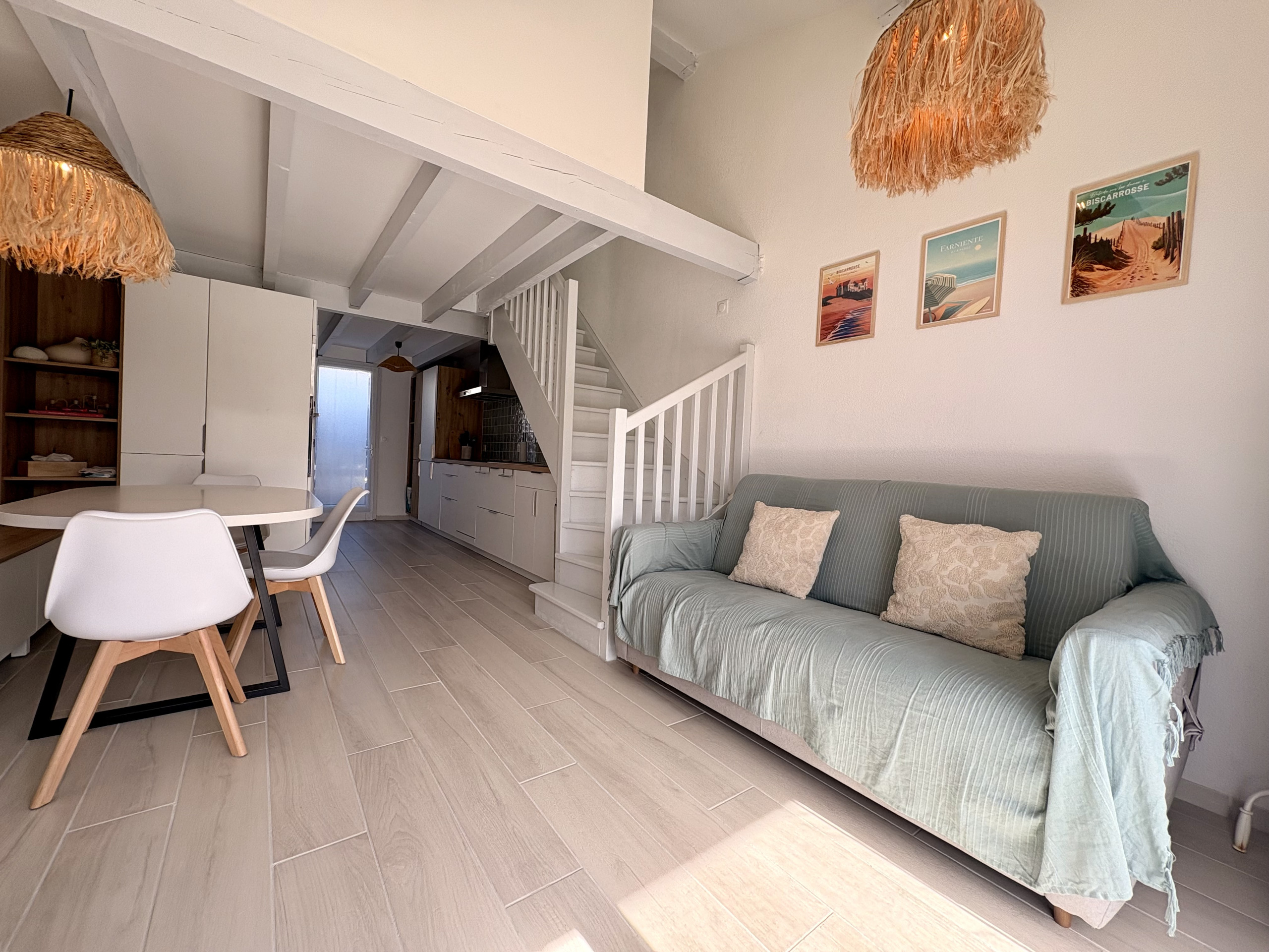 Agréable Pavillon de type T3 de 45m² entièrement renové, en duplex avec terrasse, situé dans un secteur calme, tout proche de la plage Nord. Il se compose, au rez-de-chaussée : Une Pièce de vie carrelée avec son Salon Télévision + Wifi avec son espace bureau, un canapé convertible 140cm de qualité, une table avec 4 chaises + banc, une jolie cuisine ouverte équipée : lave-vaisselle, four, micro-ondes, plaques induction 3 feux, hotte aspirante, réfrigérateur/congélateur, cafetière traditionnelle, bouilloire, grille pains, mixeur, ..