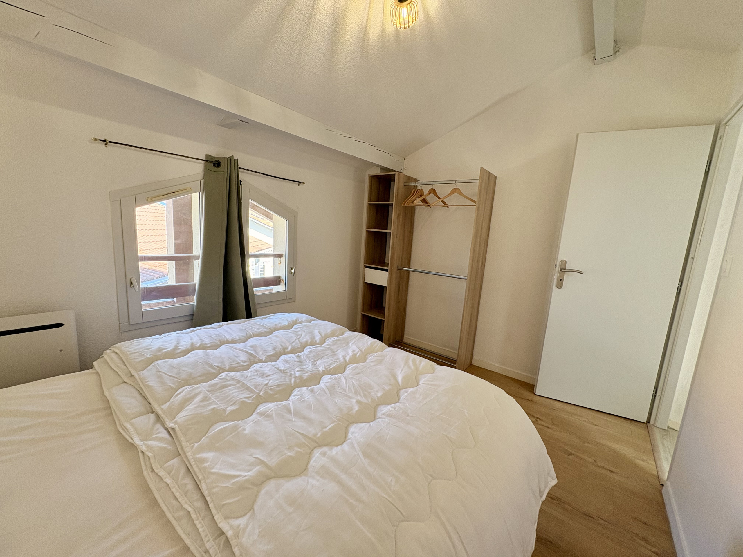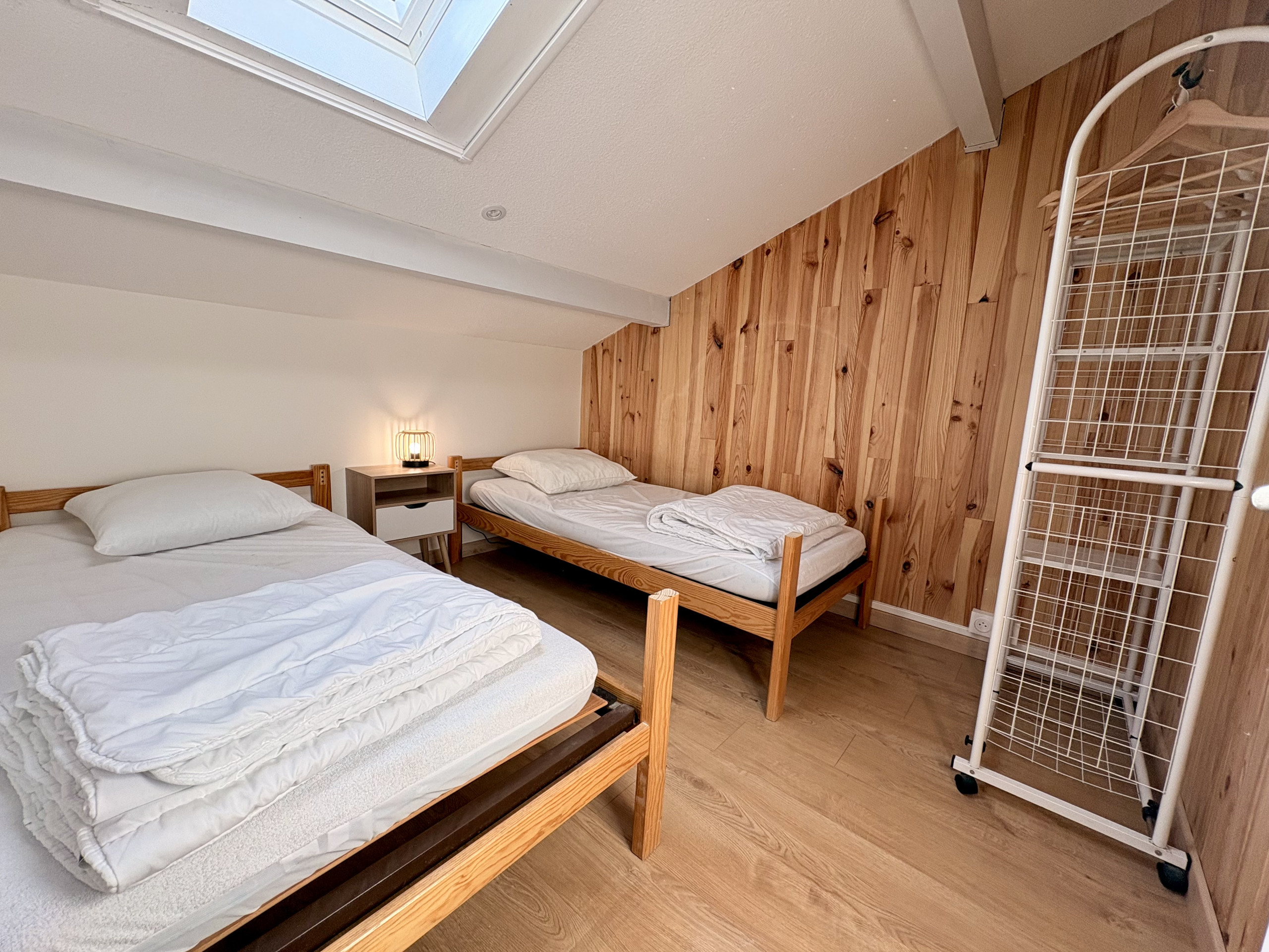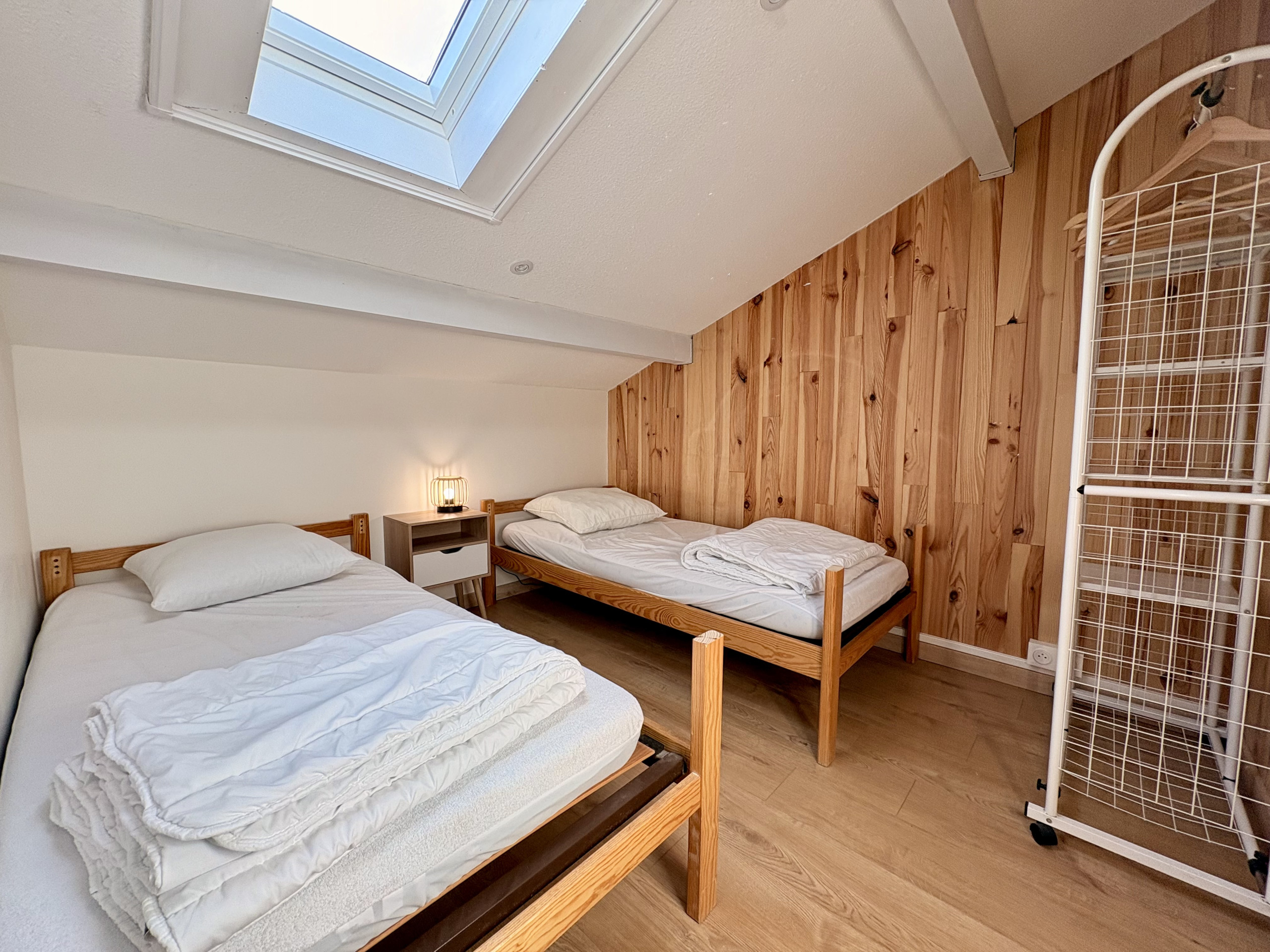 A l’étage, vous disposerez d'une chambre avec parquet, 2 lits 90cm, rangement et velux électrique. Une seconde chambre avec parquet 1 lit 160cm, rangement et 2 fenêtres avec rideau occultant.