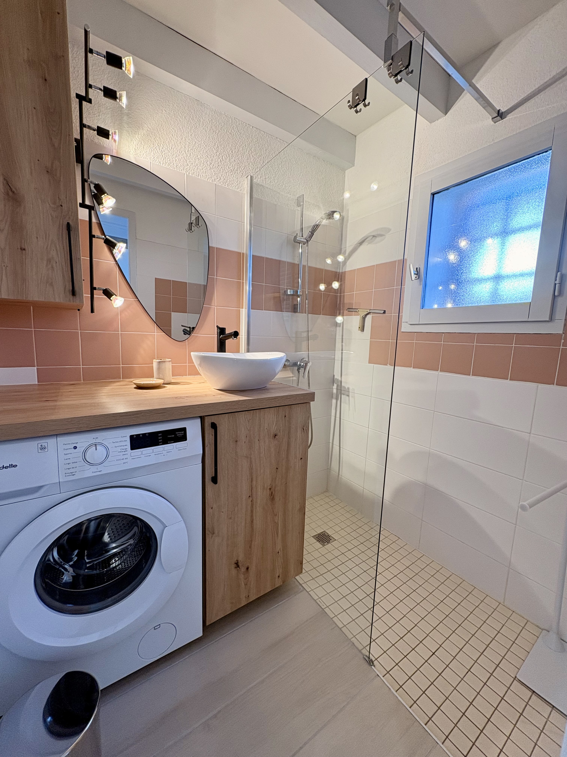 Un WC indépendant carrelé avec cumulus, une Salle d’eau carrelée avec vasque, douche italienne, sèche-serviette, lave-linge et fenêtre.