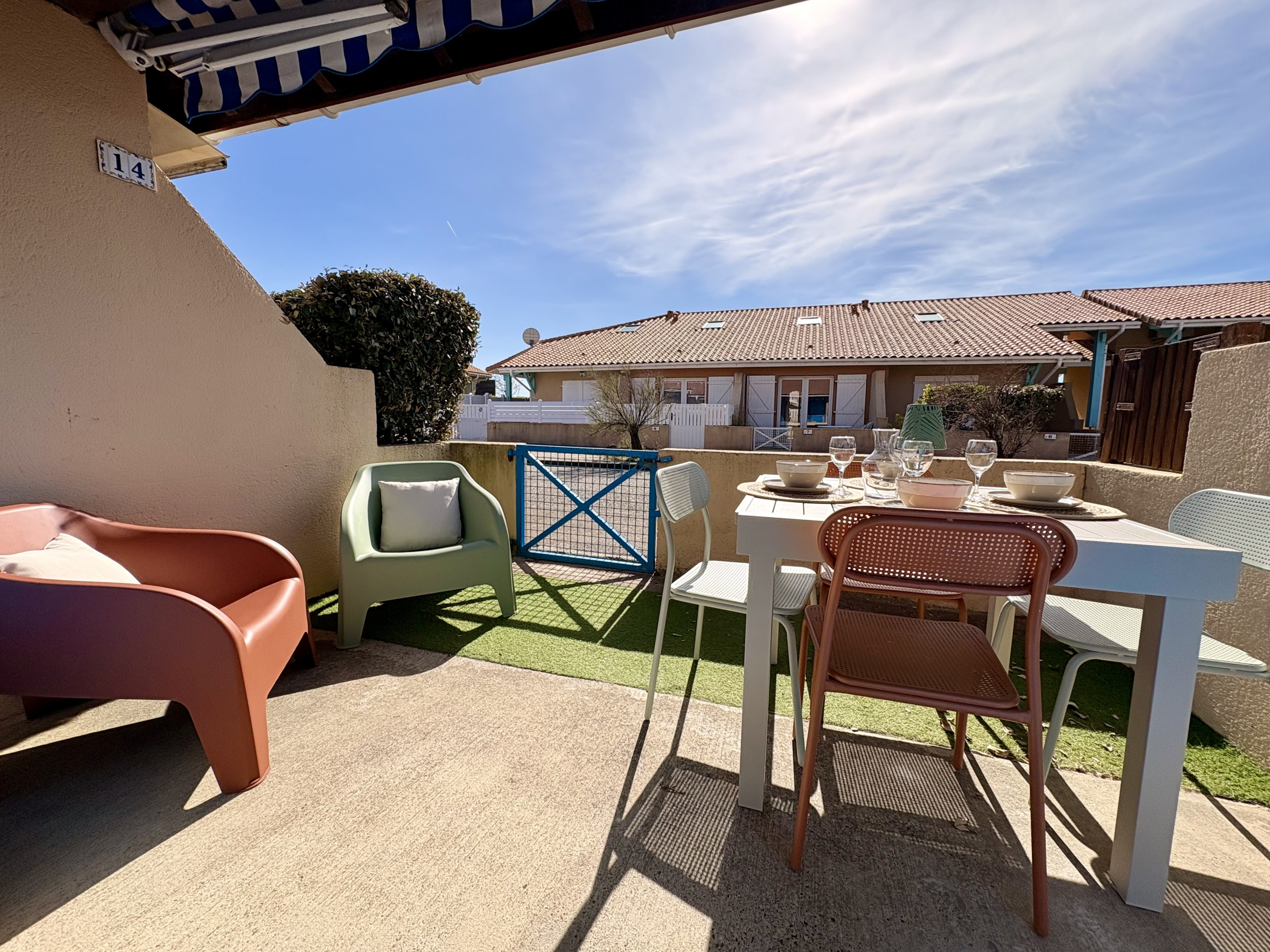 Côté extérieur : une terrasse de 10m² exposée plein Sud avec salon de jardin, plancha electrique et fauteuil. Logement pour 4/6 personnes pour une famille avec enfants. Animaux non admis.
