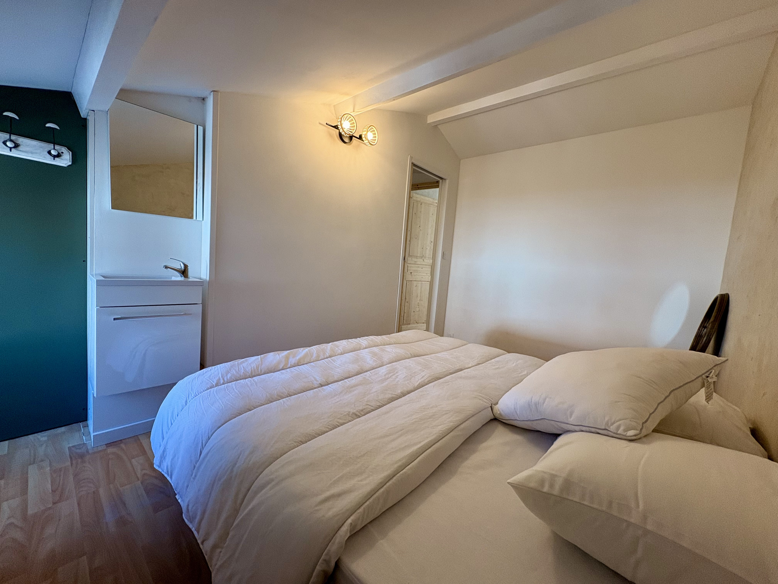 Im Obergeschoss finden Sie ein Schlafzimmer mit 1 Bett 180 cm mit Stauraum und Wasserstelle.